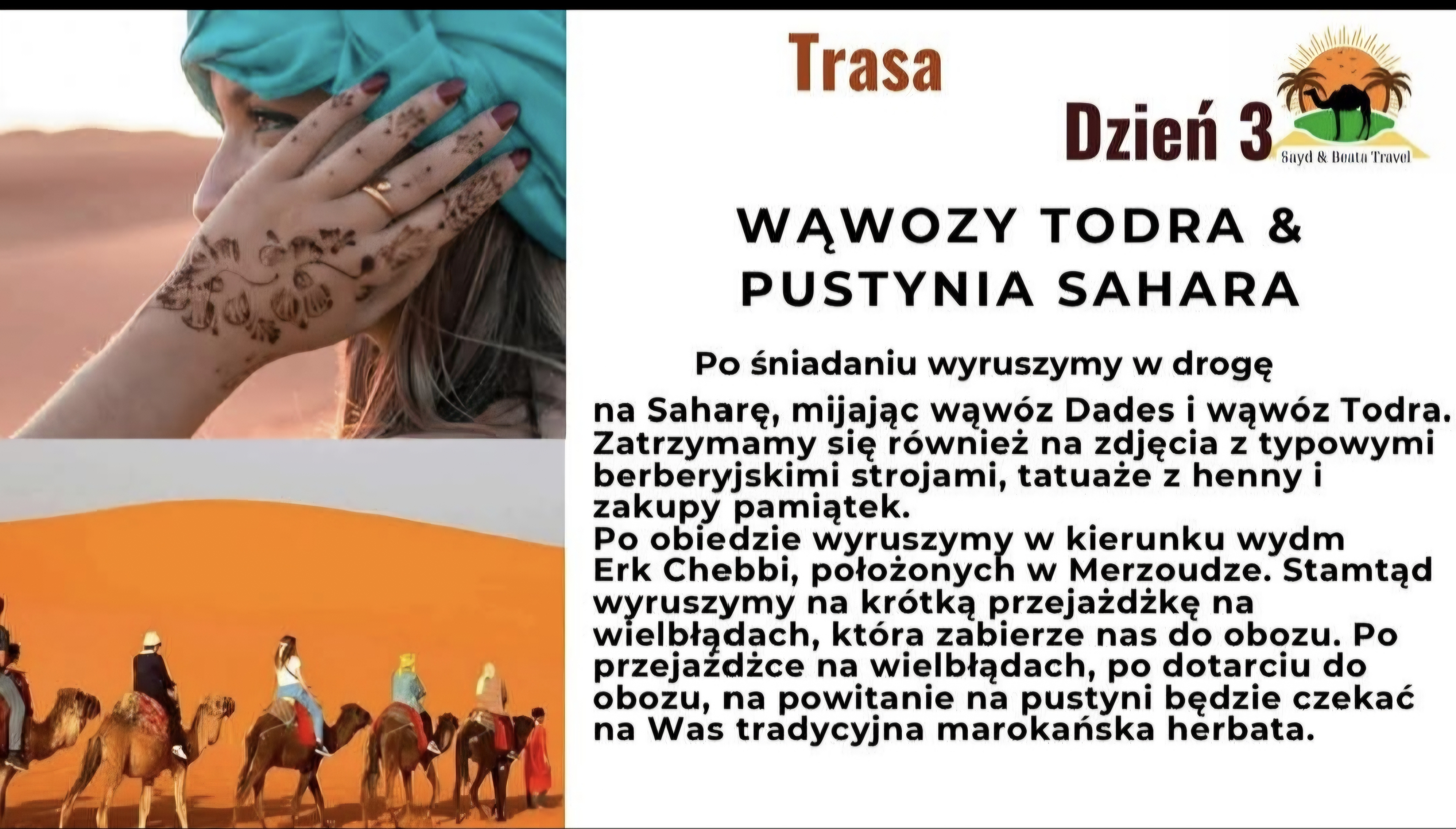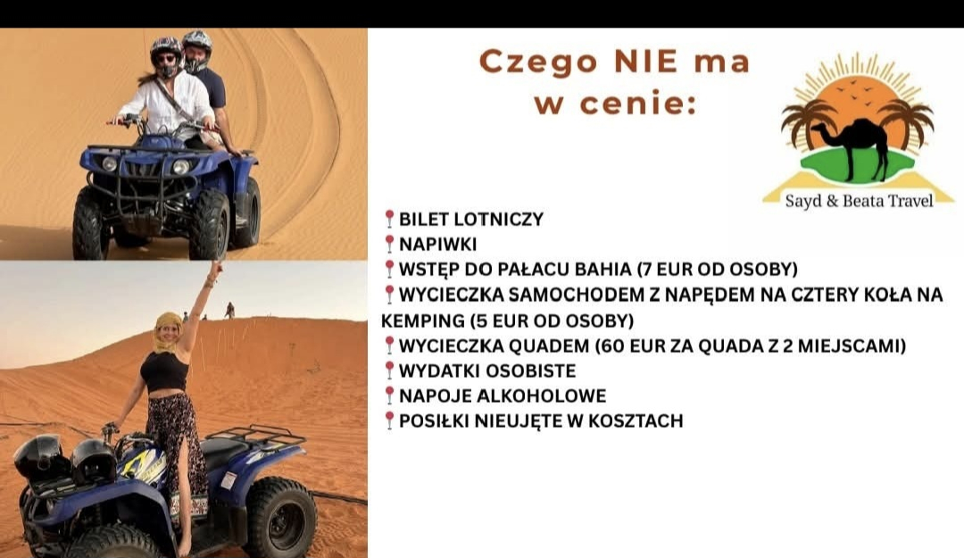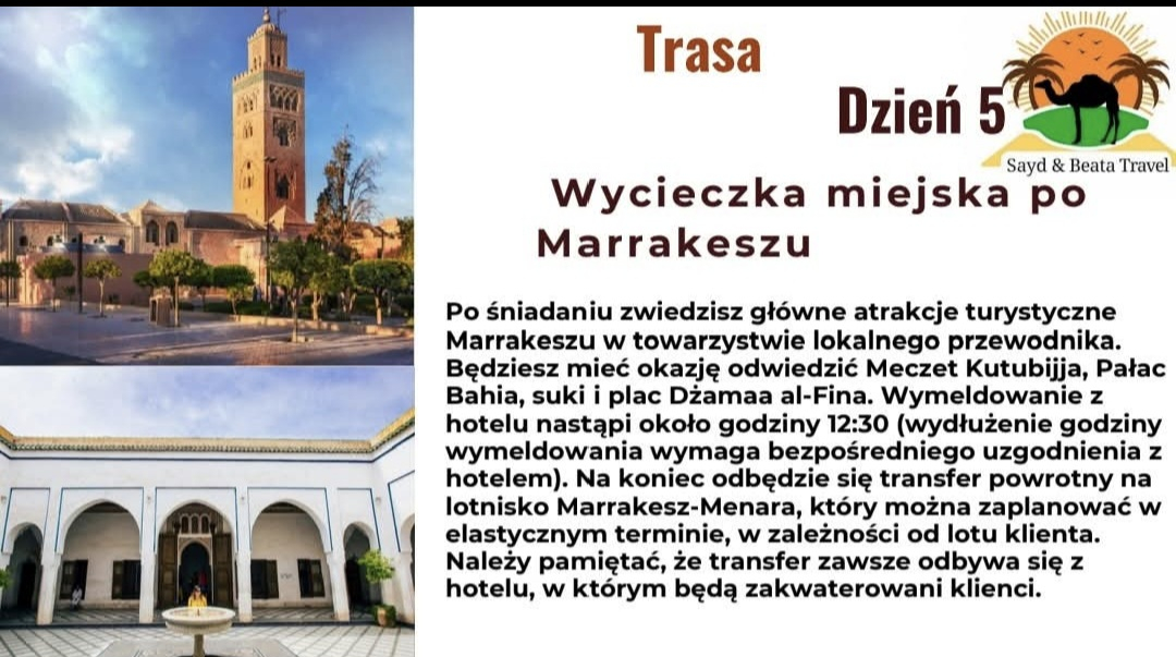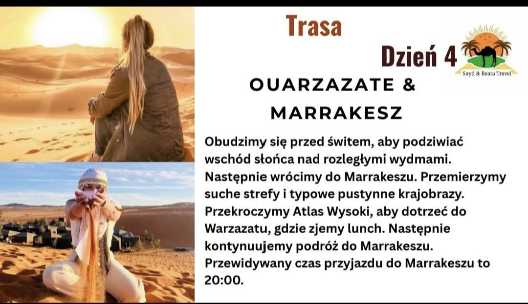 W czasie wycieczki dbamy o stały kontakt, aby uczestnik czuł się bezpiecznie i mógł skupić się na doświadczeniach związanych z odkrywaniem Maroka. Wspieramy w sytuacjach związanych z lokalnymi zwyczajami, komunikacją czy organizacją dodatkowych atrakcji. Udzielamy porad dotyczących zwiedzania kasb, medyn i pustynnych szlaków, aby podróż była maksymalnie praktyczna i komfortowa. Połączenie opieki organizacyjnej z bogatą wiedzą terenową daje pewność, że wyjazd przebiegnie płynnie.