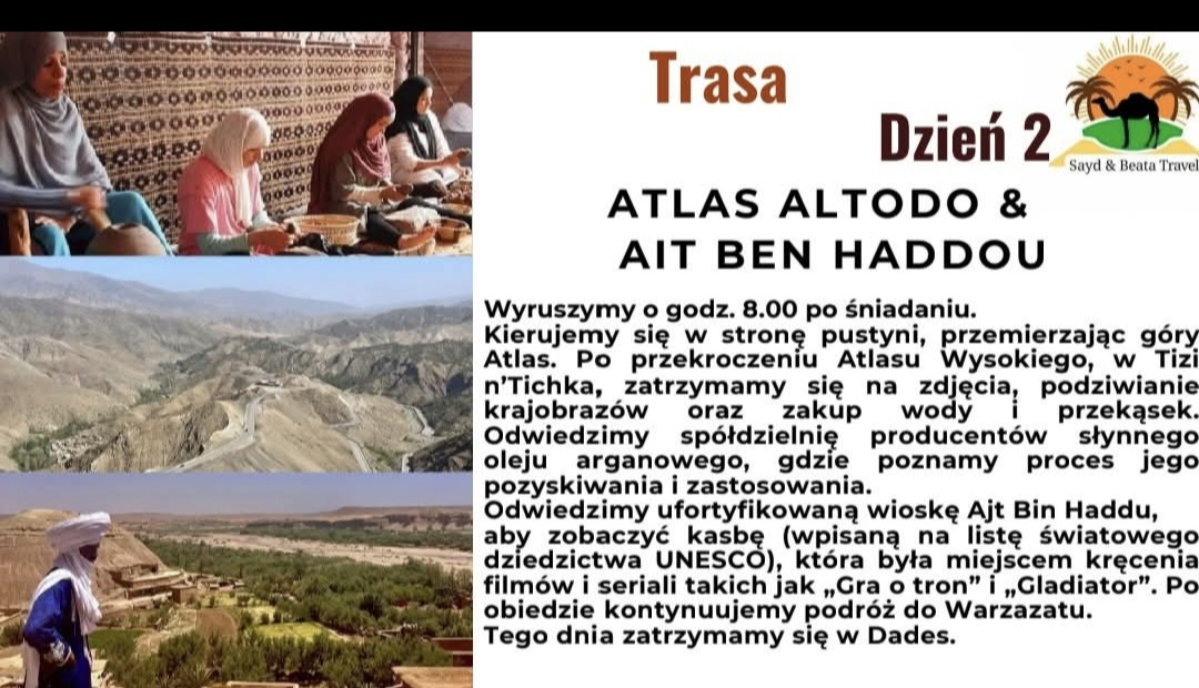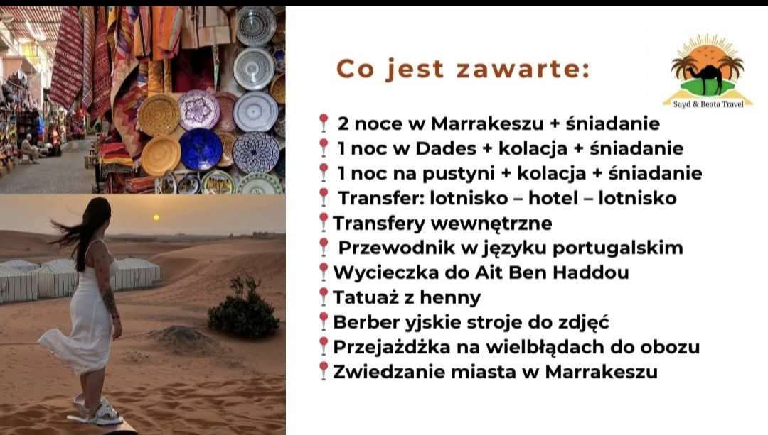 Pierwsze wycieczki po Maroku organizujemy tak, aby każdy uczestnik mógł odkryć kraj w sposób autentyczny i w pełni dopasowany do jego potrzeb. Wraz z biurem Sayd Faska Faska tworzymy programy bogate w lokalne doświadczenia. Tworzymy harmonogram tak, aby łączył odpoczynek, kulturę i praktyczne poznawanie kraju z perspektywy mieszkańców. Dbamy o to, by osoba decydująca się na podróż wiedziała dokładnie, jak przygotować się do wyjazdu i jakie elementy zapewniamy po stronie organizacyjnej. Każdy uczestnik otrzymuje pełne wsparcie, które obejmuje noclegi, atrakcje oraz logistykę na miejscu. Po stronie turysty jest zakup biletu lotniczego oraz ubezpieczenie na pobyt w Maroko.